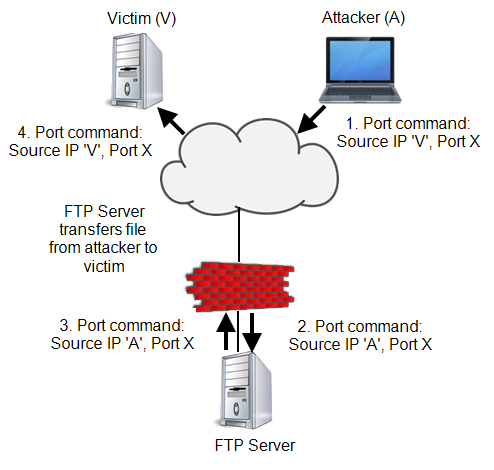 Bounce attacks - These use an FTP server in passive mode to transmit information to any device on the network. To begin the bounce attack, the attacker logs into the middleman FTP server and once connected, they send the PORT command to direct all data connections to the illegitimate destination IP address and TCP port: