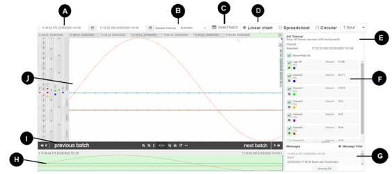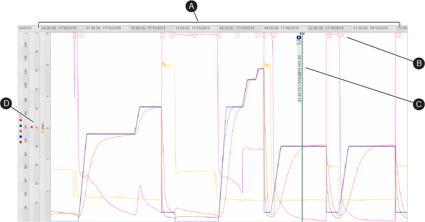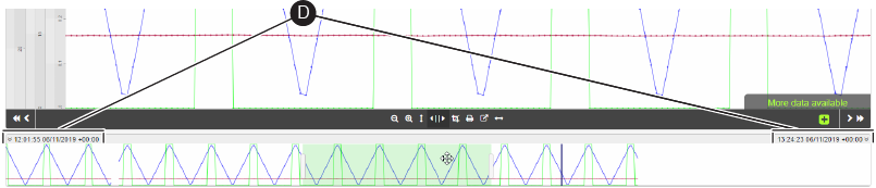 En haut du panneau Navigateur se trouvent des étiquettes de date et heure (D), qui indiquent la date et l'heure de l'ensemble des données. Ces étiquettes sont fixes et ne changent pas lorsque vous effectuez un zoom ou un panoramique sur le diagramme (sauf si vous appuyez sur le bouton Zoomer à la plage du navigateur).![]()