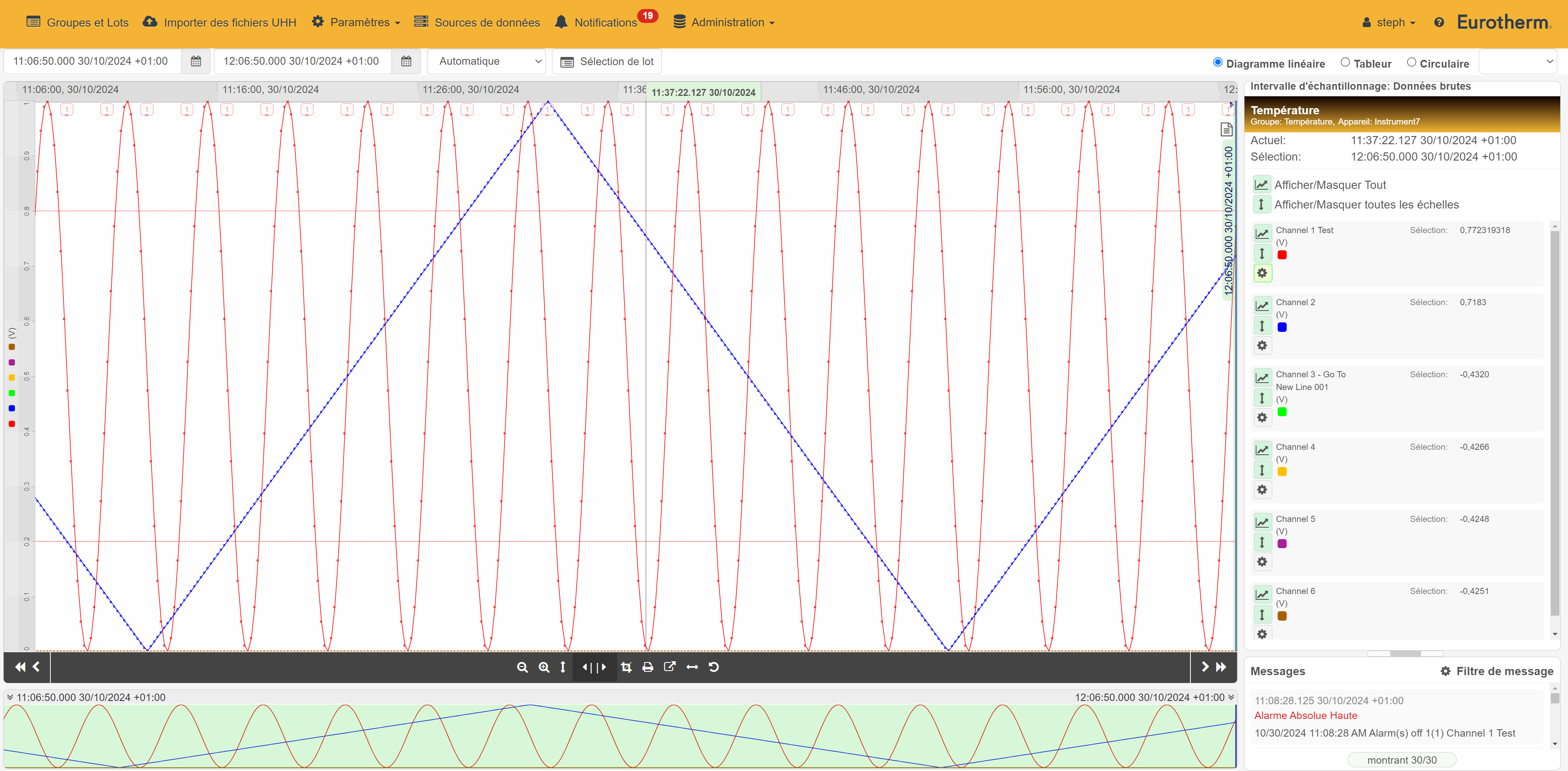Si trois voies partagent la même échelle (0 - 1000 °C), elles sont affichées sur la même échelle. - Les voies qui ne partagent pas la même échelle auront des échelles indépendantes.