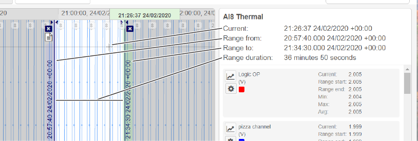 | Mode Plage : Avec un curseur vertical ajouté, cliquez pour ajouter un second curseur vertical sur le diagramme afin de définir une plage de date et d'heure pour l'analyse à partir du premier curseur vertical. Les informations affichées dans les Détails de la voie donnent des informations spécifiques à la plage pour chaque voie. Cliquez sur un curseur vertical et faites-le glisser pour étendre ou réduire la zone de l'intervalle. Cliquez sur un curseur vertical pour le mettre en surbrillance, puis cliquez dans la zone du diagramme pour déplacer ce curseur vertical (afin d'étendre ou de réduire la zone de plage). |