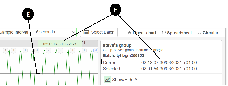Une étiquette de temps mobile et dynamique (E) s'affiche également au-dessus du panneau principal du diagramme lorsque le curseur (F) est déplacé dans le diagramme lui-même :