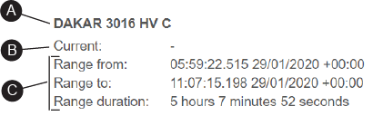 - Le champ Actuel (B) : S’affiche toujours. Lorsque le curseur est déplacé dans le diagramme, la date et l'heure sous le curseur sont affichées.