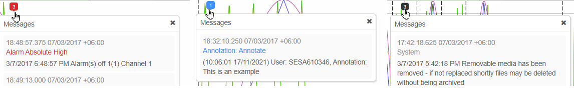 Le panneau des messages affiche les annotations, les alertes et les messages qui ont été ajoutés au fichier d'historique par l'enregistreur avant le téléchargement du fichier. Il montre également les annotations qui ont été ajoutées dans le diagramme linéaire. Il affiche également toutes les annotations ajoutées après l'import.