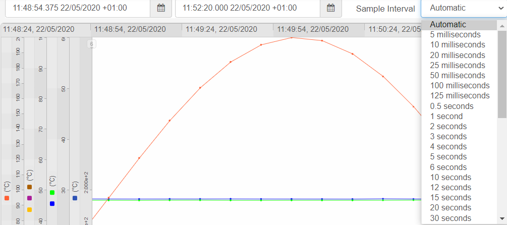 Les lignes dessinées sur le diagramme sont constituées de points de données individuels reliés par des lignes droites. Utilisez le menu déroulant Intervalle d'échantillonnage pour afficher les mêmes données du diagramme à un intervalle d'échantillonnage spécifié différent.